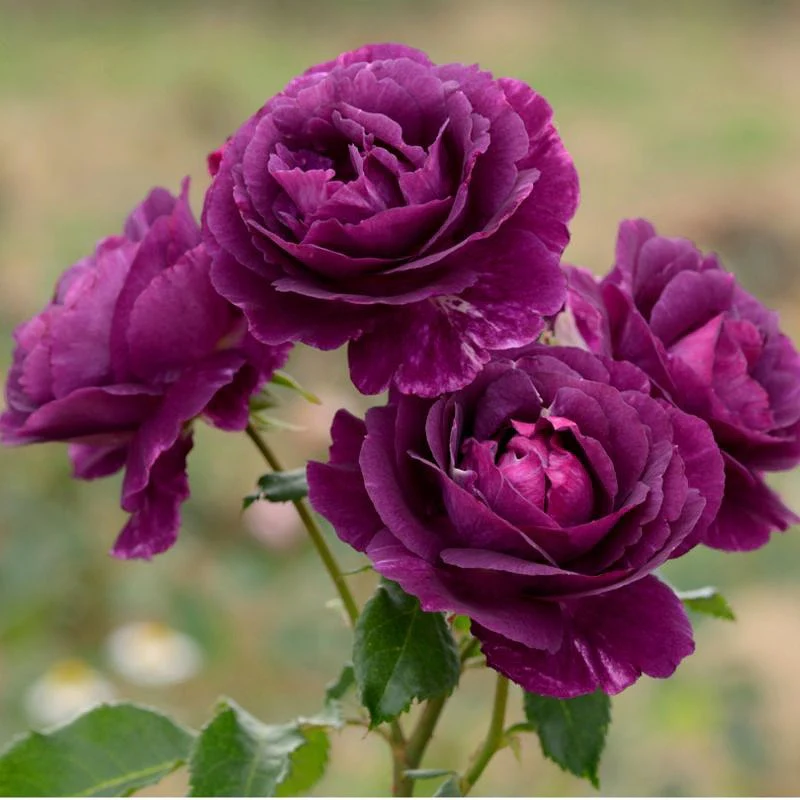 Žiedai puodelio formos, vidutiniškai dvigubi, ryškūs, violetiniai, alyviniai arba rausvai violetiniai su šviesesnėmis juostelėmis, susitelkę mažose kekėse. Kvapas stiprus. Žydėjimas kartojasi visą sezoną. Krūmai vešlūs ir stiprūs. Francois Dorieux II, Prancūzija, 2007 m