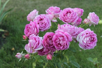 Nuostabi. Gėlės 10-13 cm skersmens, pilnavidurės (26-40 žiedlapių), alyvinės-violetinės. Aromatas stiprus.